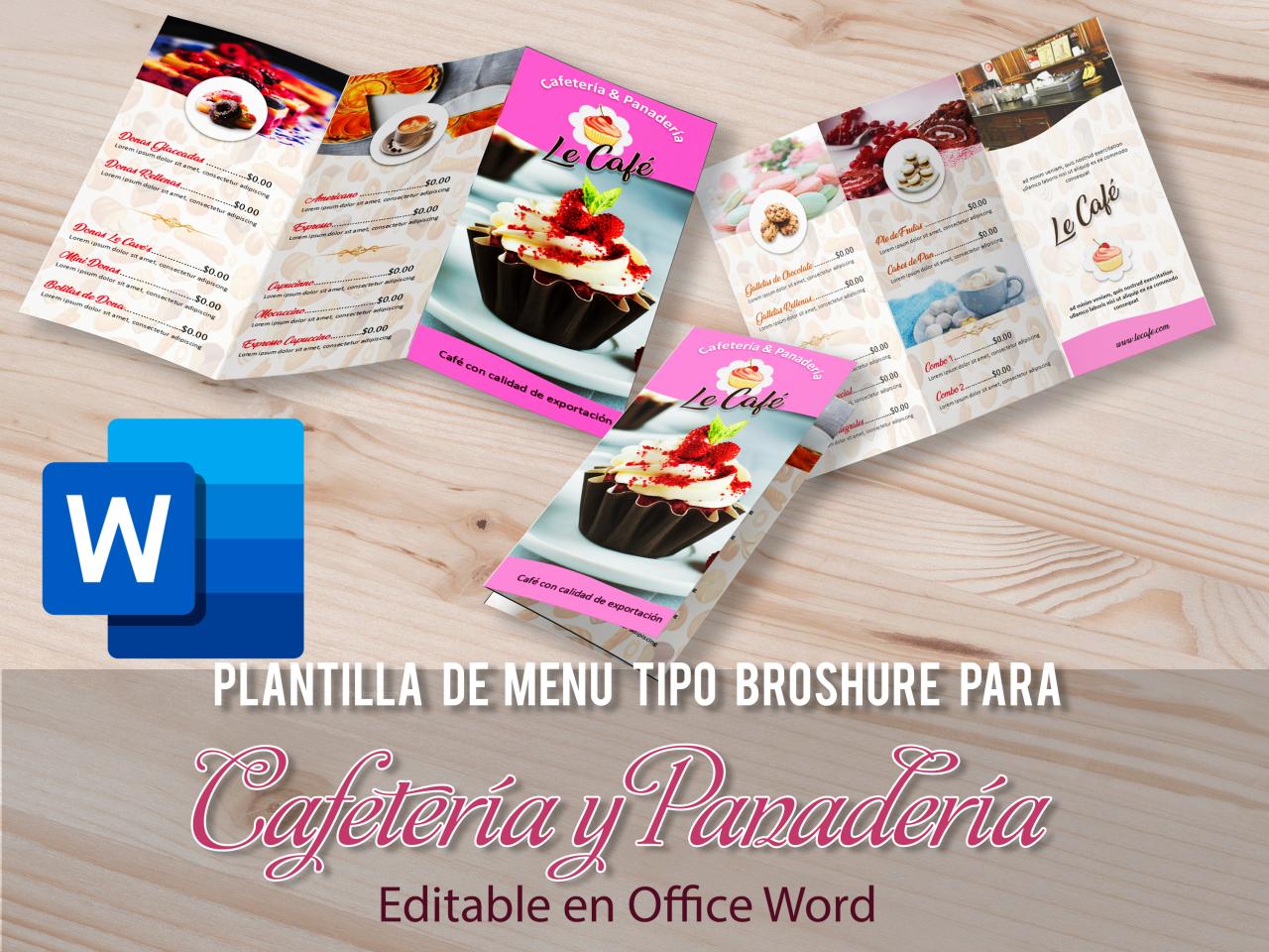 Esta es una útil plantilla de Word con la que puedes crear un bonito menú tipo broshure para tu negocio de panadería, pastelería, cafetería o restaurante, fonda, etc.